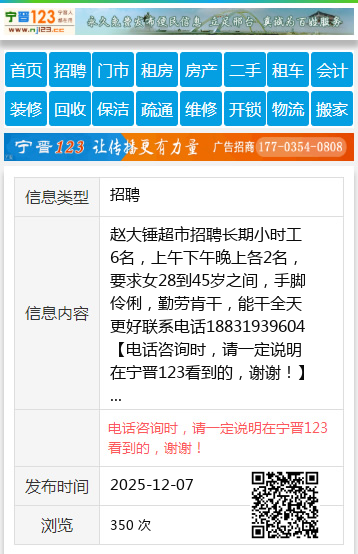 赵大锤超市招聘长期小时工6名,上午下午晚上各2名,要求女28到45岁之间,手脚伶俐,勤劳肯干,能干全天更好联系电话18831939604 【电话咨询时,请一定说明在宁晋123看到的,谢谢!】 |