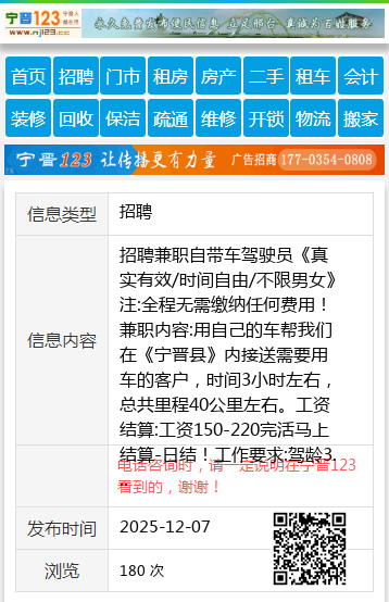 招聘兼职自带车驾驶员《真实有效/时间自由/不限男女》注:全程无需缴纳任何费用!兼职内容:用自己的车帮我们在《宁晋县》内接送需要用车的客户,时间3小时左右,总共里程40公里左右。工资结算:工资150-220完活马上结算-日结!工作要求:驾龄3年以上,车龄8年以内,限邢台市车牌私家车:轿车,越野车,商务车均可。注:冀E冀A车牌能做的加微信:DD522039或致电:15716993650 【电话咨询时,请一定说明在宁晋123看到的,谢谢!】 |
