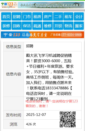 科大讯飞学习机诚聘促销精英!薪资3000-6000,五险+节日福利+年度旅游。要求女,35岁以下,有销售经验。商场工作倒班,每周休一天。加入我们,用销售点燃未来!联系电话18333478886 【电话咨询时,请一定说明在宁晋123看到的,谢谢!】 |