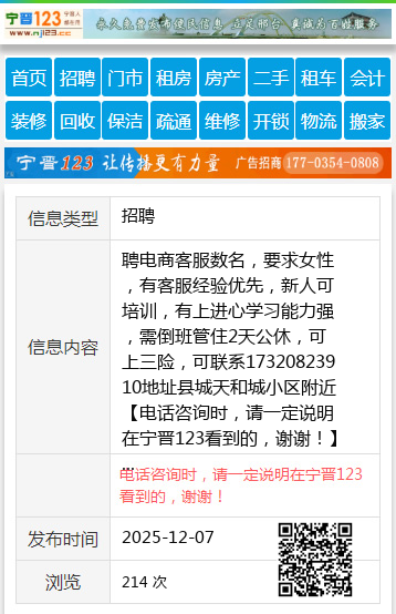 聘电商客服数名,要求女性,有客服经验优先,新人可培训,有上进心学习能力强,需倒班管住2天公休,可上三险,可联系17320823910地址县城天和城小区附近 【电话咨询时,请一定说明在宁晋123看到的,谢谢!】 |