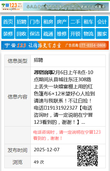 2025年12月6日上午8点-10点期间从县城往东汪308路上丢失一块婚宴棚上用的红色篷布6×12米望好心人捡到请速与我联系!不让白捡!电话19131922327 【电话咨询时,请一定说明在宁晋123看到的,谢谢!】 |