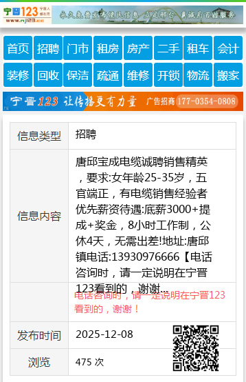 唐邱宝成电缆诚聘销售精英,要求:女年龄25-35岁,五官端正,有电缆销售经验者优先薪资待遇:底薪3000+提成+奖金,8小时工作制,公休4天,无需出差!地址:唐邱镇电话:13930976666 【电话咨询时,请一定说明在宁晋123看到的,谢谢!】 |
