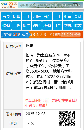 招聘:淘宝客服女20~38岁··熟练电脑打字,接受早晚班,有责任心。公休2天,工资3500~5000。地址方大科技园。电话15227727773同v 【电话咨询时,请一定说明在宁晋123看到的,谢谢!】 |