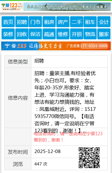 招聘:童装主播,有经验者优先;小白也可。要求:女、年龄20-35岁.形象好、踏实上进、学习沟通能力强,有想法有能力想搞钱的。地址:凤凰城附近。详询:15175935770微信同号。 【电话咨询时,请一定说明在宁晋123看到的,谢谢!】 |