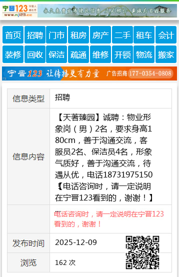 【天著臻园】诚聘:物业形象岗(男)2名,要求身高180cm,善于沟通交流,客服员2名、保洁员4名,形象气质好,善于沟通交流,待遇从优,电话18731975150!
