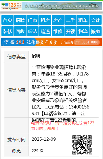 宁晋怡海物业现招聘1.形象岗:年龄18-35周岁,男178cm以上、女165cm以上,形象气质佳具备良好的沟通表达能力2.退伍军人、有物业安保或形象岗相关经验者优先,联系电话:13400156931 【电话咨询时,请一定说明在宁晋123看到的,谢谢!】 |