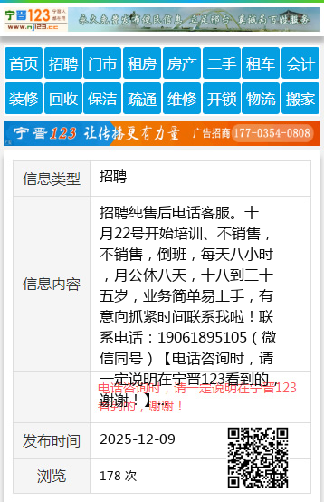 招聘纯售后电话客服。十二月22号开始培训、不销售,不销售,倒班,每天八小时,月公休八天,十八到三十五岁,业务简单易上手,有意向抓紧时间联系我啦!联系电话:19061895105(微信同号) 【电话咨询时,请一定说明在宁晋123看到的,谢谢!】 |