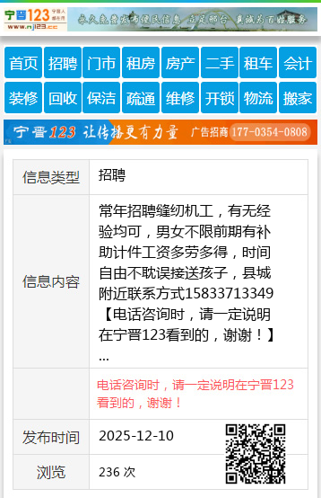 常年招聘缝纫机工,有无经验均可,男女不限前期有补助计件工资多劳多得,时间自由不耽误接送孩子,县城附近联系方式15833713349 【电话咨询时,请一定说明在宁晋123看到的,谢谢!】 |