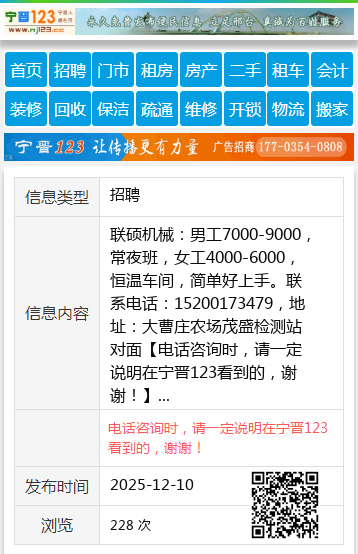 联硕机械:男工7000-9000,常夜班,女工4000-6000,恒温车间,简单好上手。联系电话:15200173479,地址:大曹庄农场茂盛检测站对面 【电话咨询时,请一定说明在宁晋123看到的,谢谢!】 |