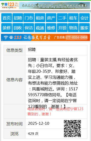 招聘:童装主播,有经验者优先;小白也可。要求:女、年龄20-35岁、形象好、踏实上进、学习沟通能力强,有想法有能力想搞钱的.地址:凤凰城附近。详询:15175935770微信同号。 【电话咨询时,请一定说明在宁晋123看到的,谢谢!】 |
