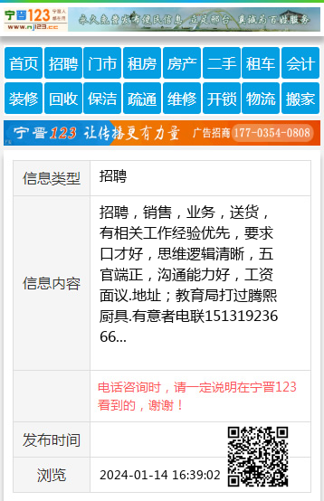 招聘,销售,业务,送货,有相关工作经验优先,要求口才好,思维逻辑清晰,五官端正,沟通能力好,工资面议.地址;教育局打过腾熙厨具.有意者电联15131923666 【电话咨询时,请一定说明在宁晋123看到的,谢谢!】 |