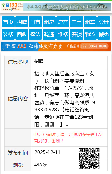 招聘聊天售后客服淘宝(女),长白班不需要倒班,工作轻松简单,17-25岁,地址:县城西二环,晶龙酒店西边,有意向做电商联系19933205287 【电话咨询时,请一定说明在宁晋123看到的,谢谢!】 |
