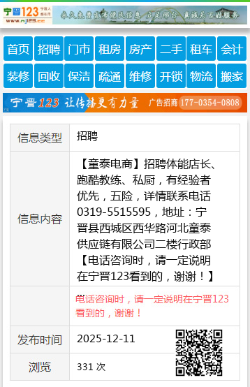 【童泰电商】招聘体能店长、跑酷教练、私厨,有经验者优先,五险,详情联系电话0319-5515595,地址:宁晋县西城区西华路河北童泰供应链有限公司二楼行政部 【电话咨询时,请一定说明在宁晋123看到的,谢谢!】 |