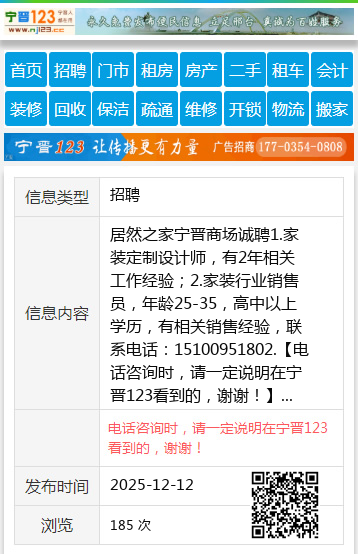 居然之家宁晋商场诚聘1.家装定制设计师,有2年相关工作经验;2.家装行业销售员,年龄25-35,高中以上学历,有相关销售经验,联系电话:15100951802. 【电话咨询时,请一定说明在宁晋123看到的,谢谢!】 |