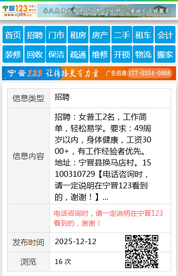 招聘:女普工2名,工作简单,轻松易学。要求:49周岁以内,身体健康,工资3000+,有工作经验者优先。地址:宁晋县换马店村。15100310729 【电话咨询时,请一定说明在宁晋123看到的,谢谢!】 |