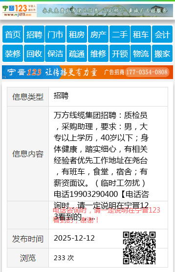 万方线缆集团招聘:质检员,采购助理,要求:男,大专以上学历,40岁以下;身体健康,踏实细心,有相关经验者优先工作地址在尧台,有班车,食堂,宿舍;有薪资面议。(临时工勿扰)电话19903290400 【电话咨询时,请一定说明在宁晋123看到的,谢谢!】 |