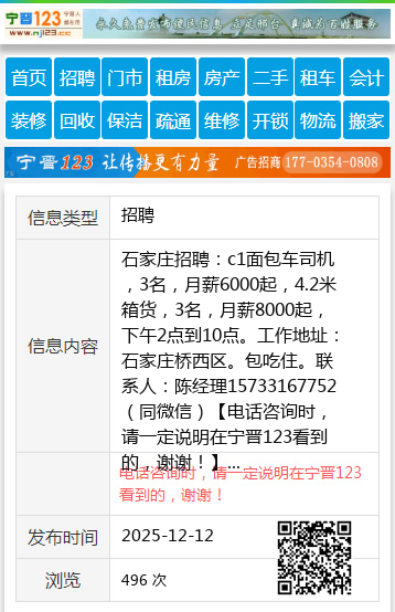 石家庄招聘:c1面包车司机,3名,月薪6000起,4.2米箱货,3名,月薪8000起,下午2点到10点。工作地址:石家庄桥西区。包吃住。联系人:陈经理15733167752(同微信) 【电话咨询时,请一定说明在宁晋123看到的,谢谢!】 |
