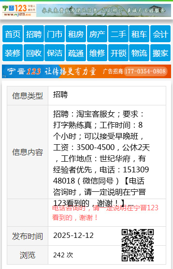 招聘:淘宝客服女;要求:打字熟练真;工作时间:8个小时;可以接受早晚班,工资:3500-4500,公休2天,工作地点:世纪华府,有经验者优先,电话:15130948018(微信同号) 【电话咨询时,请一定说明在宁晋123看到的,谢谢!】 |