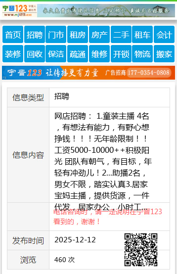 网店招聘: 1.童装主播 4名,有想法有能力,有野心想挣钱!!!无年龄限制!!工资5000-10000++积极阳光 团队有朝气,有目标,年轻有冲劲儿!2...助播2名,男女不限,踏实认真3.居家宝妈主播,提供货源,一件代发,居家办公,小时工 有工作经验者优先录用!!!!!男女不限地址:东亚 菜市场 大医院附近 县城 ,联系电话15533197597 【电话咨询时,请一定说明在宁晋123看到的,谢谢!】 |