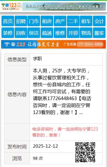 本人男,25岁,大专学历,从事过餐饮管理相关工作,想找一份县城内的工作,任何工作均可尝试,有需要的请联系17726448463