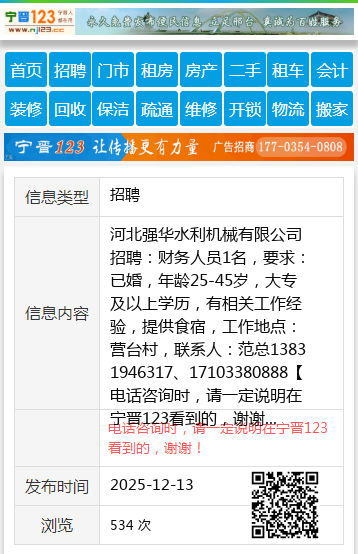 河北强华水利机械有限公司招聘:财务人员1名,要求:已婚,年龄25-45岁,大专及以上学历,有相关工作经验,提供食宿,工作地点:营台村,联系人:范总13831946317、17103380888 【电话咨询时,请一定说明在宁晋123看到的,谢谢!】 |