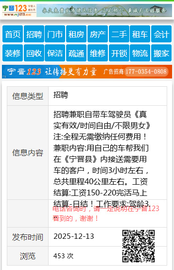 招聘兼职自带车驾驶员《真实有效/时间自由/不限男女》注:全程无需缴纳任何费用!兼职内容:用自己的车帮我们在《宁晋县》内接送需要用车的客户,时间3小时左右,总共里程40公里左右。工资结算:工资150-220完活马上结算-日结!工作要求:驾龄3年以上,车龄8年以内,限邢台市车牌私家车:轿车,越野车,商务车均可。注:冀E冀A车牌能做的加微信:DD522039或致电:15716993650 【电话咨询时,请一定说明在宁晋123看到的,谢谢!】 |