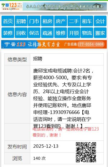 唐邱宝成电缆诚聘:会计2名,薪资4000-5000。要求:有专业经验优先、大专及以上学历、2年以上电缆行业会计经验、能独立操作全盘账务并使用记账软件。地点唐邱申经理-13930976666 【电话咨询时,请一定说明在宁晋123看到的,谢谢!】 |