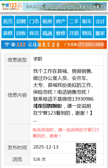 找个工作在县城、男做销售、做过办公室人员、会开车、大专、县城找份类似的工作、保险勿扰!电话销售勿扰!联系电话不是微信13930986865不是微信