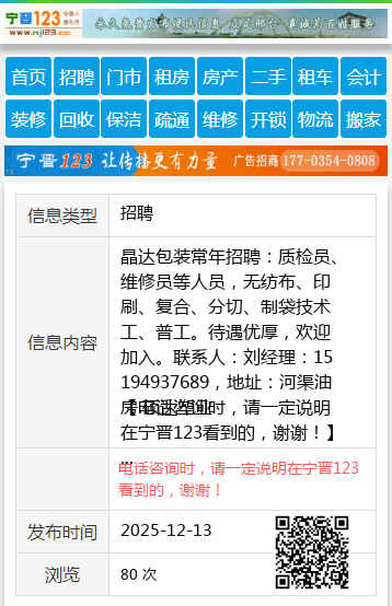 晶达包装常年招聘:质检员、维修员等人员,无纺布、印刷、复合、分切、制袋技术工、普工。待遇优厚,欢迎加入。联系人:刘经理:15194937689,地址:河渠油房.硕达塑业