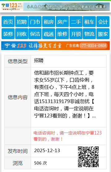 信和超市招长期钟点工,要求女55岁以下,口齿伶俐,有责任心,下午4点上班,8点下班,每天四个小时,电话15131319179非诚勿扰 【电话咨询时,请一定说明在宁晋123看到的,谢谢!】 |
