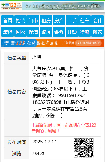 大曹庄农场玩具厂招工,食堂厨师1名,身体健康,(60岁以下)一日三餐,工资3000元