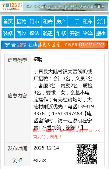 宁晋县大陆村镇大贾线机械厂招聘:会计3名,文员3名,客服3名,内勤2名,质检3名,要求:女,会基本电脑操作;有无经验均可,大陆村附近优先!电话13931933761;13513197483 【电话咨询时,请一定说明在宁晋123看到的,谢谢!】 |