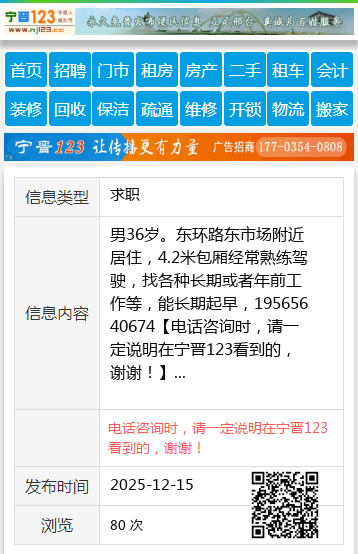 男36岁。东环路东市场附近居住,4.2米包厢经常熟练驾驶,找各种长期或者年前工作等,能长期起早,19565640674