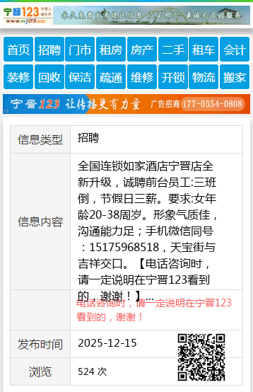 全国连锁如家酒店宁晋店全新升级,诚聘前台员工:三班倒,节假日三薪。要求:女年龄20-38周岁。形象气质佳,沟通能力足;手机微信同号:15175968518,天宝街与吉祥交口。 【电话咨询时,请一定说明在宁晋123看到的,谢谢!】 |