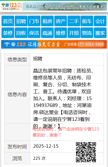 晶达包装常年招聘:质检员、维修员等人员,无纺布、印刷、复合、分切、制袋技术工、普工。待遇优厚,欢迎加入。联系人:刘经理:15194937689,地址:河渠油房.硕达塑业 【电话咨询时,请一定说明在宁晋123看到的,谢谢!】 |
