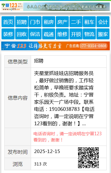 夹星堂抓娃娃店招聘服务员,最好做过销售的,工作轻松简单,早晚班要求踏实肯干,积极负责。地址:宁晋家乐园天一广场中段。联系电话:19106038783 【电话咨询时,请一定说明在宁晋123看到的,谢谢!】 |