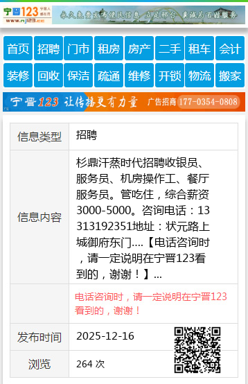 杉鼎汗蒸时代招聘收银员、服务员、机房操作工、餐厅服务员。管吃住,综合薪资3000-5000。咨询电话:13313192351地址:状元路上城御府东门…. 【电话咨询时,请一定说明在宁晋123看到的,谢谢!】 |