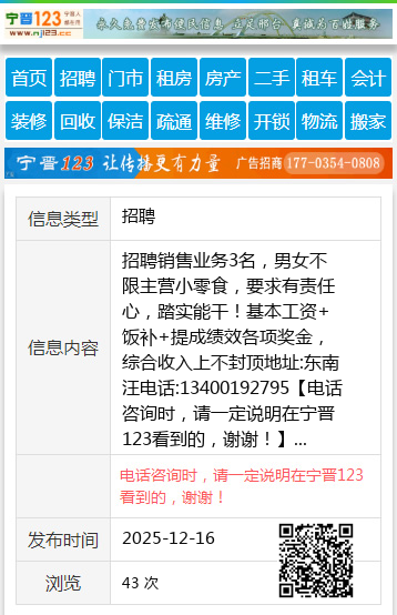 招聘销售业务3名,男女不限主营小零食,要求有责任心,踏实能干!基本工资+饭补+提成绩效各项奖金,综合收入上不封顶地址:东南汪电话:13400192795 【电话咨询时,请一定说明在宁晋123看到的,谢谢!】 |