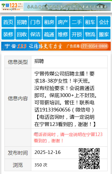 宁晋传媒公司招聘主播!要求18-38岁女性!半天班。没有经验要求!会说普通话即可。保底3000+上不封顶。可带薪培训。管住!联系电话19133960656(微信号) 【电话咨询时,请一定说明在宁晋123看到的,谢谢!】 |