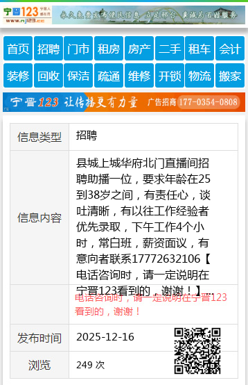 县城上城华府北门直播间招聘助播一位,要求年龄在25到38岁之间,有责任心,谈吐清晰,有以往工作经验者优先录取,下午工作4个小时,常白班,薪资面议,有意向者联系17772632106 【电话咨询时,请一定说明在宁晋123看到的,谢谢!】 |
