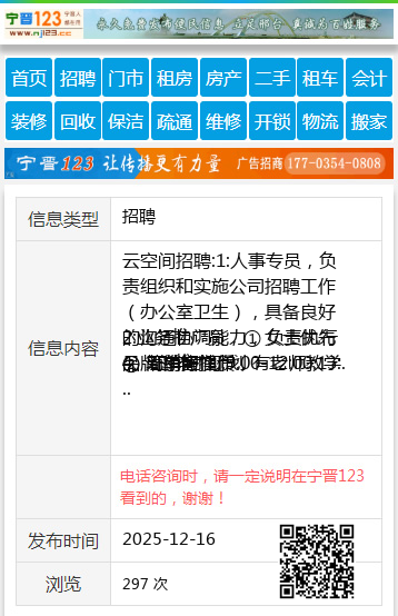 云空间招聘:1:人事专员,负责组织和实施公司招聘工作(办公室卫生),具备良好的沟通协调能力,女士优先