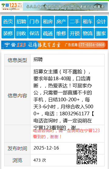 招募女主播(可不露脸),要求年龄18-40周,口齿清晰,,热爱表达!可居家办公,只需要一部直播不卡的手机,日结100-200+,每天3-6小时,月综合收入5000+,电话:18032961177 【电话咨询时,请一定说明在宁晋123看到的,谢谢!】 |