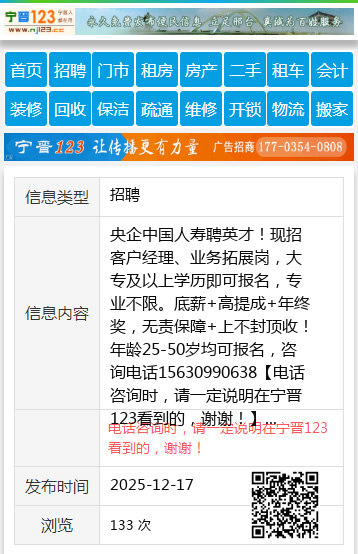 央企中国人寿聘英才!现招客户经理、业务拓展岗,大专及以上学历即可报名,专业不限。底薪+高提成+年终奖,无责保障+上不封顶收!年龄25-50岁均可报名,咨询电话15630990638 【电话咨询时,请一定说明在宁晋123看到的,谢谢!】 |