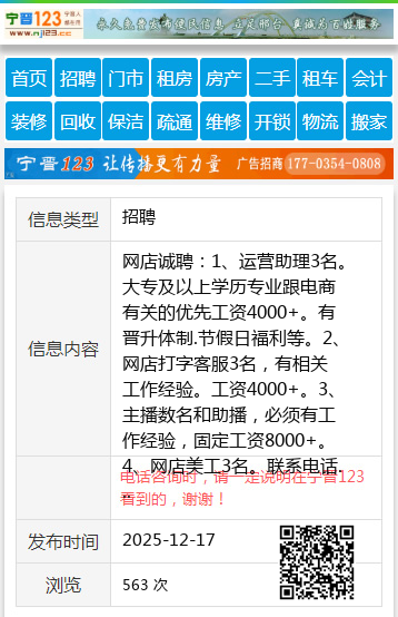 网店诚聘:1、运营助理3名。大专及以上学历专业跟电商有关的优先工资4000+。有晋升体制.节假日福利等。2、网店打字客服3名,有相关工作经验。工资4000+。3、主播数名和助播,必须有工作经验,固定工资8000+。4、网店美工3名。联系电话 13303194319 宁高路电视台西行 【电话咨询时,请一定说明在宁晋123看到的,谢谢!】 |