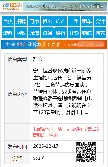 宁晋恒基现代城附近一家养生馆招聘店长一名,销售员2名,工资待遇优厚面谈,节假日公休,要求有责任心上进心,干过销售优先