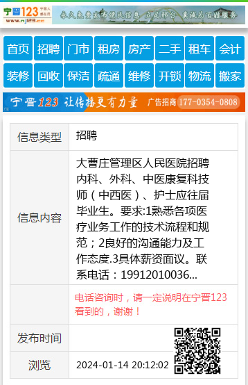 大曹庄管理区人民医院招聘内科、外科、中医康复科技师(中西医)、护士应往届毕业生。要求:1熟悉各项医疗业务工作的技术流程和规范;2良好的沟通能力及工作态度.3具体薪资面议。联系电话:19912010036 【电话咨询时,请一定说明在宁晋123看到的,谢谢!】 |
