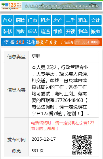 本人男,25岁,行政管理专业,大专学历,擅长与人沟通、打交道。想找一份县城内或县城周边的工作,各类工作均可尝试,随时上岗。有需要的可联系17726448463 【电话咨询时,请一定说明在宁晋123看到的,谢谢!】 |