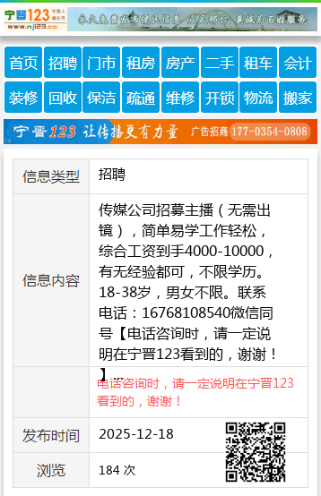 传媒公司招募主播(无需出镜),简单易学工作轻松,综合工资到手4000-10000,有无经验都可,不限学历。18-38岁,男女不限。联系电话:16768108540微信同号 【电话咨询时,请一定说明在宁晋123看到的,谢谢!】 |