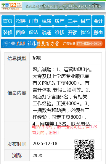 网店诚聘:1、运营助理3名。大专及以上学历专业跟电商有关的优先工资4000+。有晋升体制.节假日福利等。2、网店打字客服3名,有相关工作经验。工资4000+。3、主播数名和助播,必须有工作经验,固定工资8000+。4、网店美工3名。联系电话 13303194319 宁高路电视台西行 【电话咨询时,请一定说明在宁晋123看到的,谢谢!】 |