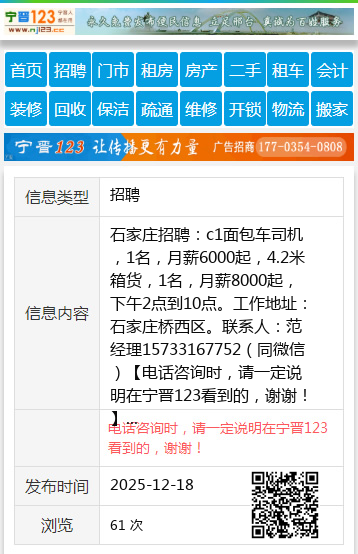 石家庄招聘:c1面包车司机,1名,月薪6000起,4.2米箱货,1名,月薪8000起,下午2点到10点。工作地址:石家庄桥西区。联系人:范经理15733167752(同微信) 【电话咨询时,请一定说明在宁晋123看到的,谢谢!】 |